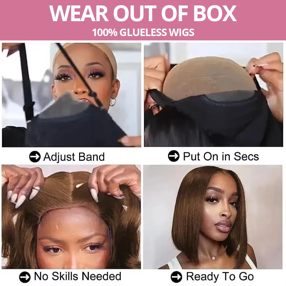 Experience effortless style with this glueless chocolate brown bob wig, featuring a 7x5 lace front for a natural hairline and easy application. Crafted from preplucked, 180-density straight human hair in four rich tones, it offers a realistic look and comfortable wear. Ready to wear right out of the box, this wig combines convenience with expert craftsmanship for a flawless, versatile finish.
