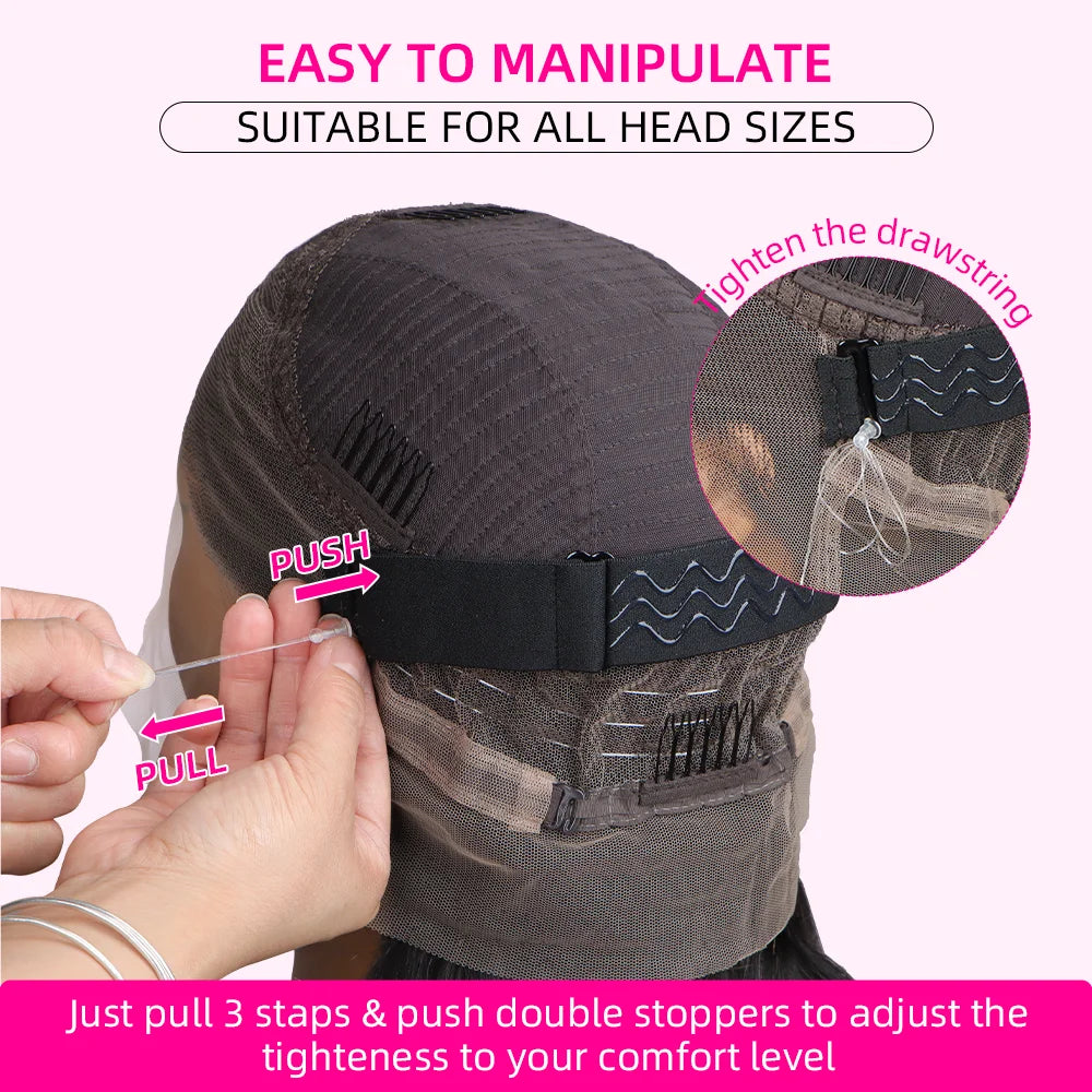 Experience seamless style with the Invisi Strap 360 Glueless Full Lace Front Wig. Crafted from premium human hair, this HD straight wig features a 13x4 lace frontal that offers a natural hairline and versatile parting. Pre-plucked for a realistic look and equipped with a drawstring for secure, comfortable wear without glue. Ideal for women seeking a flawless, easy-to-wear wig that blends effortlessly with their scalp for a confident, polished appearance.